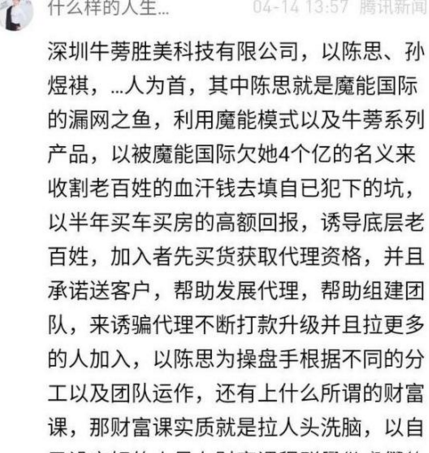 据悉,2018年微商摩能国际老板蒋德才因涉嫌传销被查,旗下账号悉数被冻结,而旗下品牌也遭受信任危机,纷纷脱离,而陈思就是其一,在和昔日供货商,徐州天益合作之后不理想,而转而和吉九合作,运营新品牌牛蒡大王。一个本身就有涉嫌传销的嫌疑的人,所谓的“创业”也是令人深思。