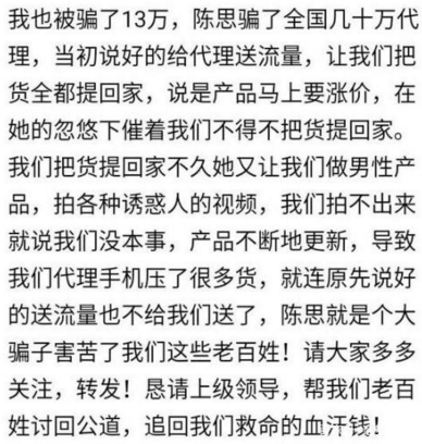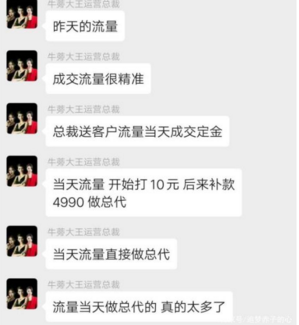 有代理表示投了18000元加入牛蒡大王做总代,上线一直让她背话术,期间没有任何收入,除了喊口号,接下来就是陈思总裁讲课,陈思在群里发语音讲到,让总代通过公司送的流量客源变的更赚钱之类的激进话术。”