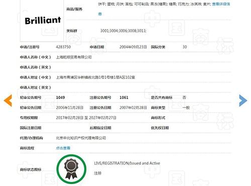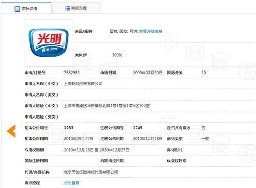 从中国商标网查询得知,Brilliant商标及光明商标确系上海乾顺贸易有限公司所有,但商标类别仅包含饼干、蛋糕、面包、月饼、可可制品、果冻、糖果、巧克力、冰淇淋、麦片,未写明包含饮料类。