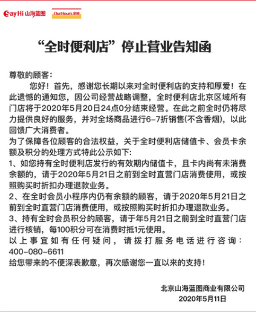 5月11日,北京OurHours全时便利店通过微信公众号发布通知指出,因公司经营战略调整,全时便利店北京区域所有门店将于2020年5月20日24点0分结束经营。
