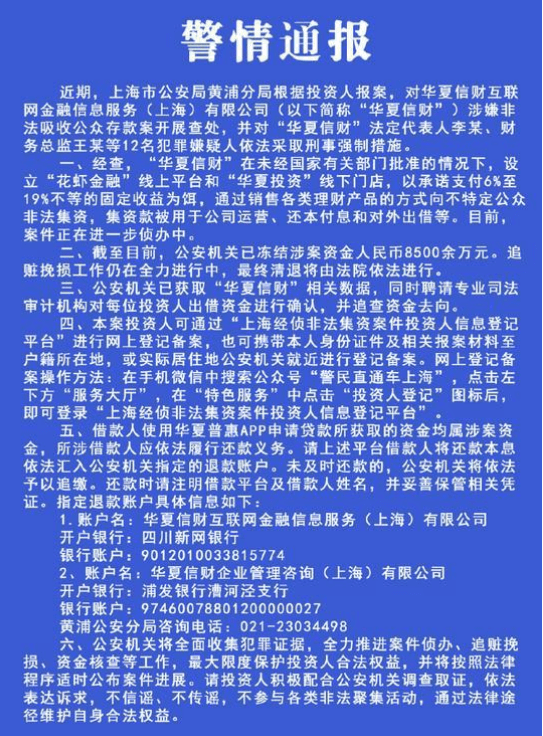 5月13日,上海警方发布通报,对华夏信财互联网金融信息服务(上海)有限公司(以下简称“华夏信财”)涉嫌非法吸收公众存款案开展查处,并对“华夏信财”法定代表人李某、财务总监王某等12名犯罪嫌疑人依法采取刑事强制措施。