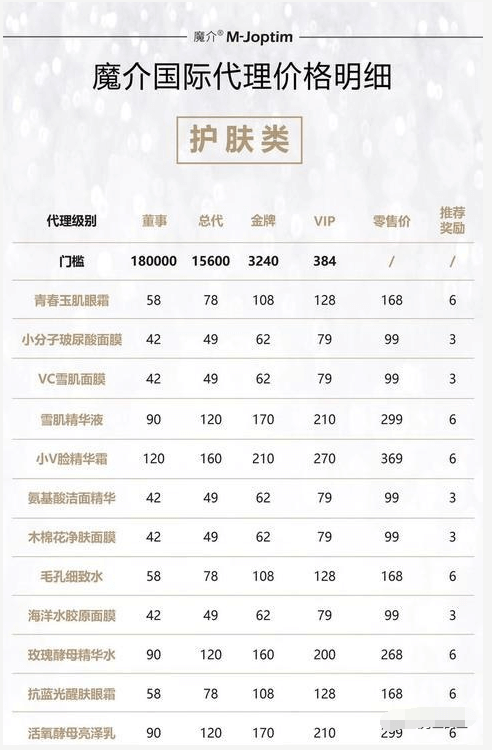 这样的产品质量和宣传方式与很多传销盘如出一辙。蓝米作为魔介品牌联合创始人,在介绍魔介项目的时候,几乎没有提到产品相关,除了简单分析了一下零售利润可观,一直围绕着“推荐奖励”在不断的延伸。蓝米一直在分析,拿低门槛的金牌,不如拿9800元的总代(现涨价为19800),诱导代理拿更高门槛的级别。实际上19800元以上的代理,已经很难通过零售来获得利润。按照魔介公布的价格表,以青春玉肌眼霜为例,总代的拿货价格是78元,超过250支产品,代理靠零售不知道猴年马月。而180000元的董事,通过零售根本卖不完,只有不断的拉人头,拉人头能够迅速卖完,一赚人头差价,二赚奖励。至于这些货能不能卖出去,会不会砸在手里,我们不得而知。