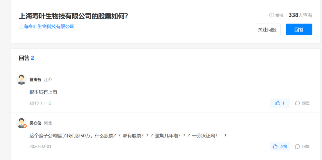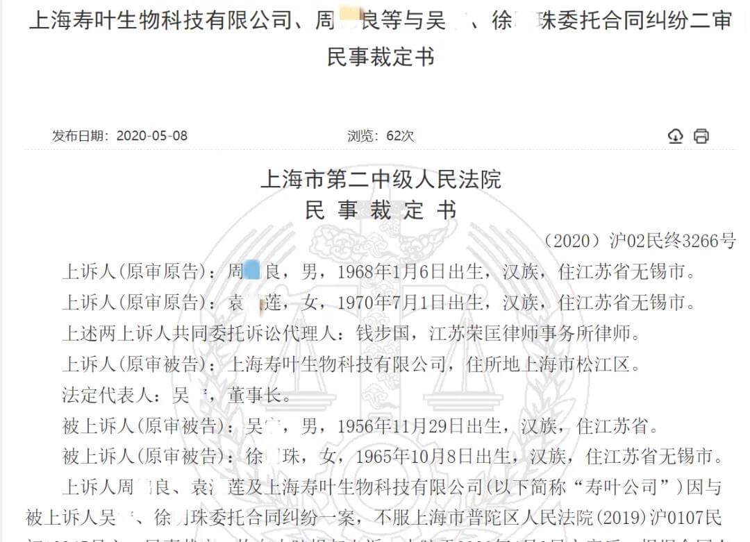 据天眼查显示,2019年以来,上海寿叶生物公司多次因“承揽合同纠纷”、“委托理财合同纠纷”、“委托合同纠纷”、“买卖合同纠纷”,被企业和个人诉上法庭,其中尤以被个人起诉的“委托合同纠纷案”数量为最多,而上述周某良、袁某莲起诉上海寿叶生物公司及其法定代表人吴宁,即是其中之一。