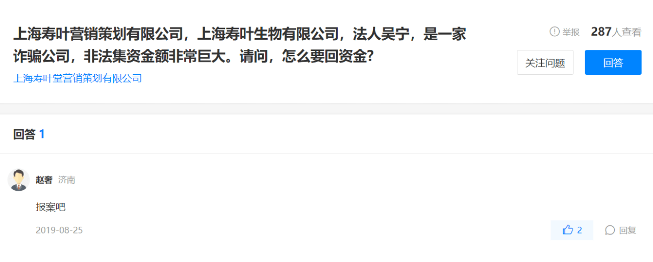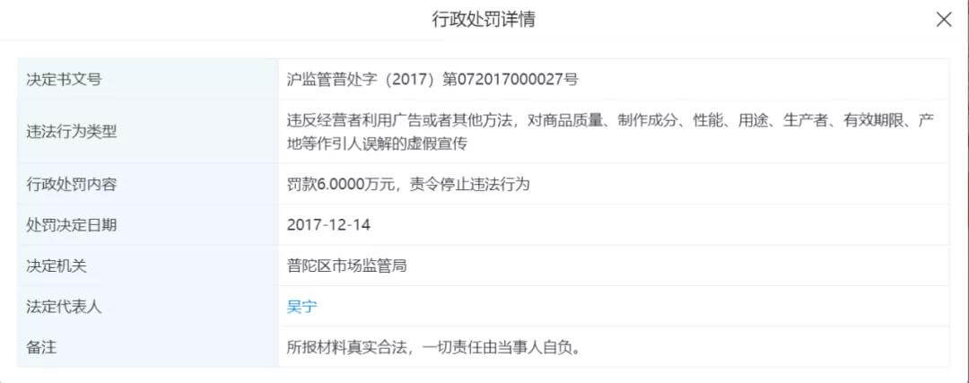 2017年12月14日,上海寿叶生物科技有限公司被普陀区市场监管局以“违反经营者利用广告或者其他方法,对商品质量、制作成分、性能、用途、生产者、有效期限、产地等作引人误解的虚假宣传”为由处罚6万元。