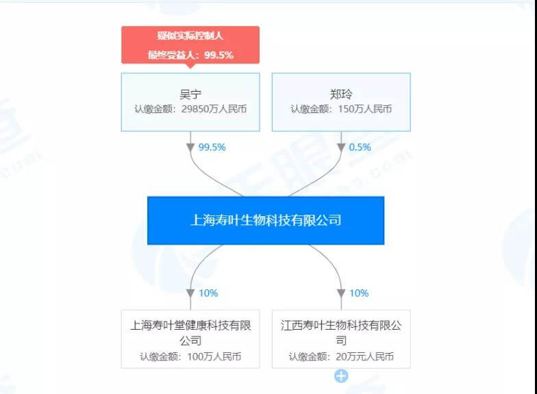 据天眼查显示,上海寿叶生物公司成立于2011年11月,注册资本金3亿元,实缴资本1000万元,公司法定代表人吴宁,同时为公司执行董事及持股99.5%的大股东,公司监事郑玲,同时为公司持股0.5%的小股东。公司旗下共有2家参股公司,一家为江西寿叶生物科技有限公司,注册资本200万元,公司出资20万元,占股10%,另一家为上海寿叶堂健康科技有限公司,注册资本1000万元,公司出资100万元,占股10%。