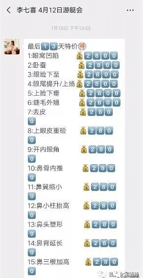 据报道,李七喜投资了几家整形医院,推出了自己的整形套餐。