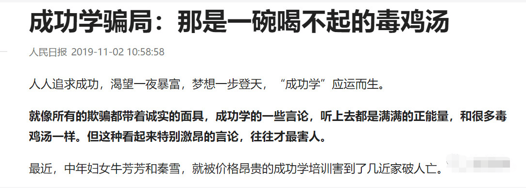 2019年,人民日报发布文章《成功学骗局:那是一碗喝不起的毒鸡汤》。