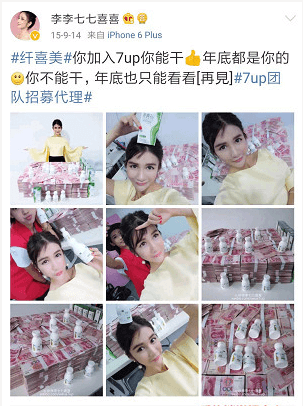 做微商,招代理,李七喜创立了自己的微商产品,创建自己的团队7up,她用半年时间就搭建起了4000人的代理团队,疯狂炫富鼓励大众投资,从中渔利。