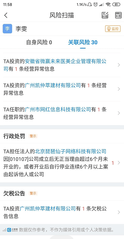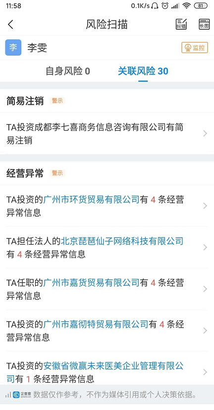 根据李七喜相关的公开资料和相关的投资经历对比得知,李七喜真名李雯,作为投资人、法人的身份开设多家公司,其公司结果可见下图: