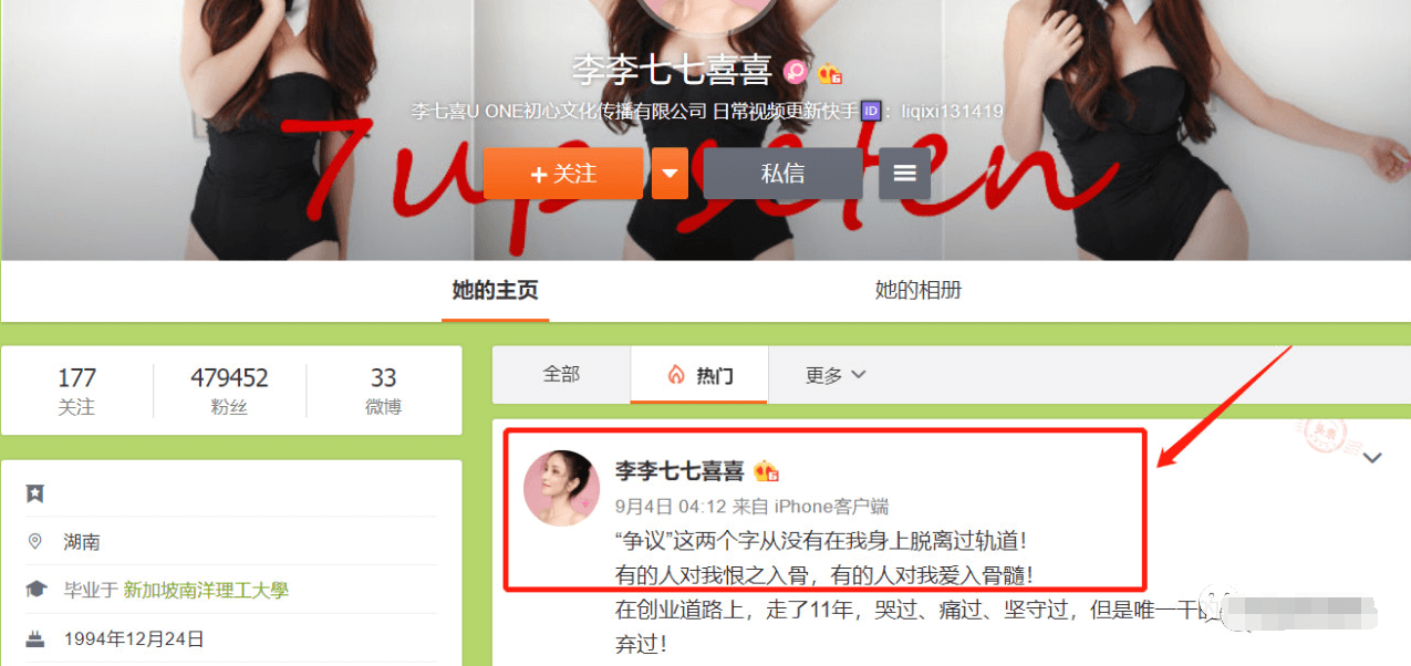 面对质疑,除了删除消极言论,在2019年9月4日的微博中,李七喜做出正面回应。
