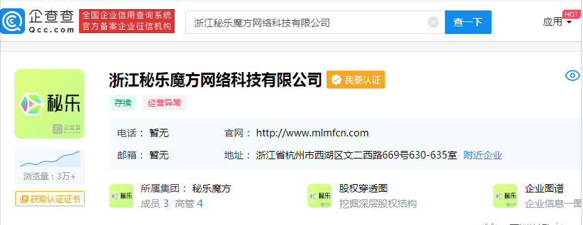 据悉,秘乐魔方短视频由浙江秘乐魔方网络科技有限公司开发。据企查查显示,该公司成立于2019年11月28日,注册资金5000万元,实缴资本暂缺,法定代表人于2020年4月15日由金银辉变更为金根达。金银辉为公司大股东、实际控制人,持股40%。而法人代表金根达却并未拥有任何股权。该公司于4月20日被宁波市鄞州区市场监督管理局定为经营异常。原因是通过登记的住所或经营场所无法取得联系。