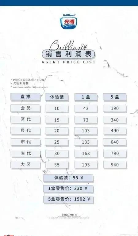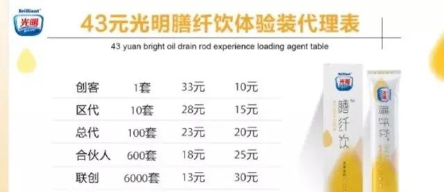 据了解到,加入光明新零售做代理有两种选择,其一是需要花费330元注册购买一盒产品成为vip,其二是花费1490元注册购买5盒套餐成为区代。“如果是事业型,推荐从县代起步最佳。”那么所谓“县代”又是什么意思呢?