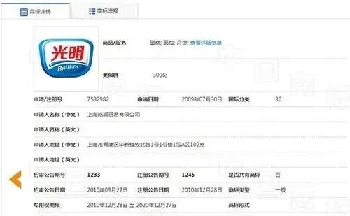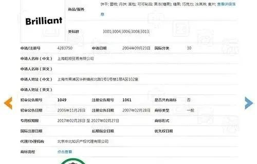 从中国商标网查询得知,Brilliant商标及光明商标确系上海乾顺贸易有限公司所有,但商标类别仅包含饼干、蛋糕、面包、月饼、可可制品、果冻、糖果、巧克力、冰淇淋、麦片,未写明包含饮料类。