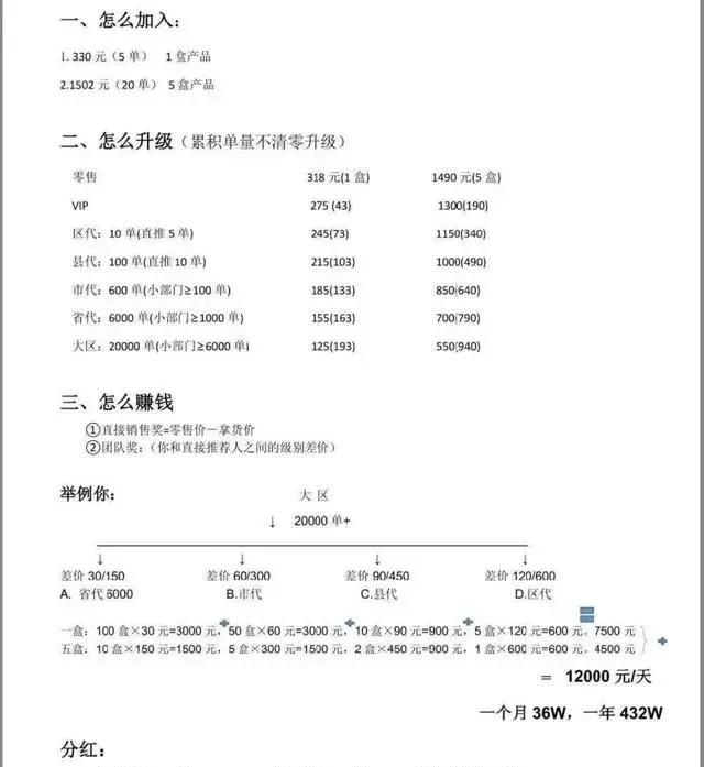 另外,表格还显示当前存在着“直接销售奖和团队奖”,其中,直接销售奖即零售价与拿货价的差额,而团队奖为你和直接推荐人之间的级别差价。还以大区代理举了例子:作为大区代理,若包含省代、市代、县代、区代等级别,销售一盒及五盒差价为30/150、60/300、90/450、120/600,若再分别乘以100/10、50/5、10/2、5/1盒的销售数量,一天就能获利12000元,一个月36万元,一年432万元。