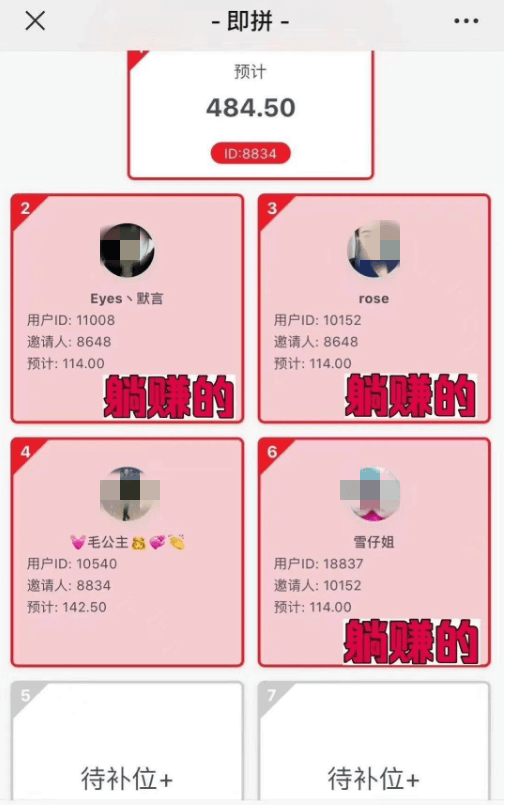 即拼是怎么赚钱?“直推150,间推120,有2层利润,是合法的模式。那么,7人成团的利润是6个直推900、5个直推870、4个直推840、3个直推810、2个直推780、1个直推750、0个直推720。”据相关人士高层表示:“如果你能够直推200个人,可以层层复制下去,那意味着你的2级间推有1200人,你的3级间推有7200人,四代关系43200人,那跟你溯源的人就有51200人,一天出1000个团,一个团挣700-900元,你一天可以挣72万-90万,你就是千万级的一年。”