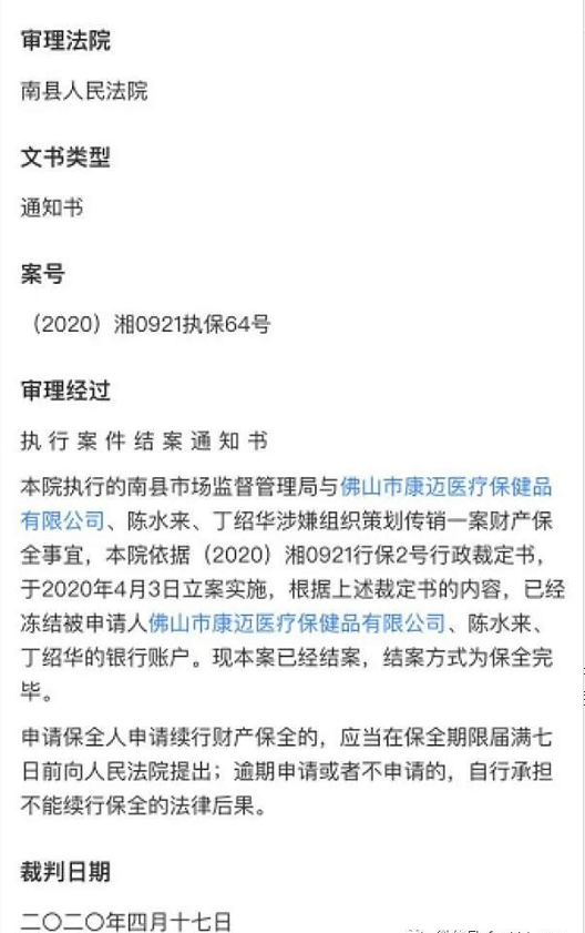 佛山康迈医疗保健品公司及公司股东陈水来、丁绍华“涉嫌组织策划传销”被法院冻结银行账户
