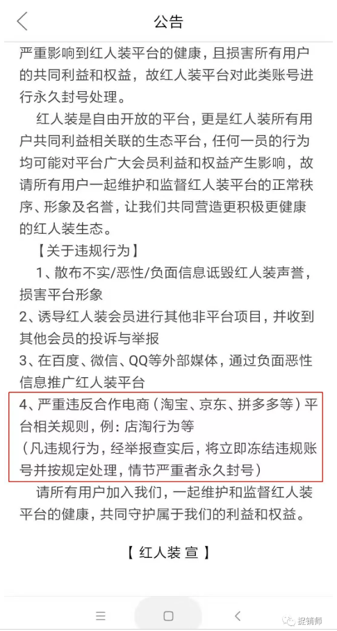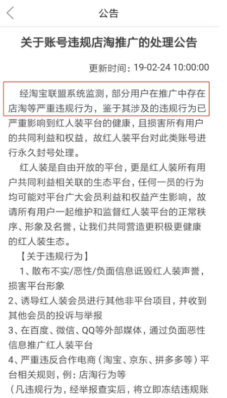 而红人装APP则在2019年2月24日发布公告,认为此违规行为是部分用户所为: