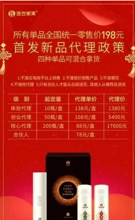 为什么还有这么多人说它好呢?这些人一般都是代理商,因为他们有一套吸引人的奖励制度,利润可观,合伙人(批发商)晋升:两个月内直推5位核心代理,个人业绩累计达到2000支,即可申请晋升合伙人。要求:成为合伙人后每三个月累计完成1000支业绩作为考核标准。合伙人利益:1)全国最低价78元;团队进货价每支奖励8元;享受533佣金;运作三级代理;享受全球每支5元分红。