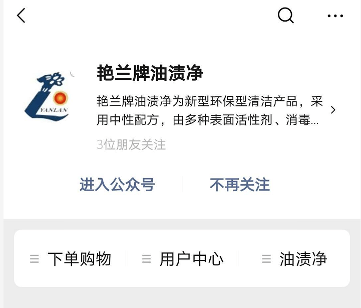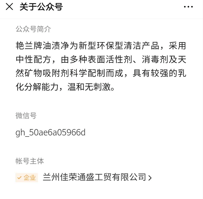 公众号名称为艳兰牌油渍净,其认证主体为兰州佳荣通盛工贸有限公司。