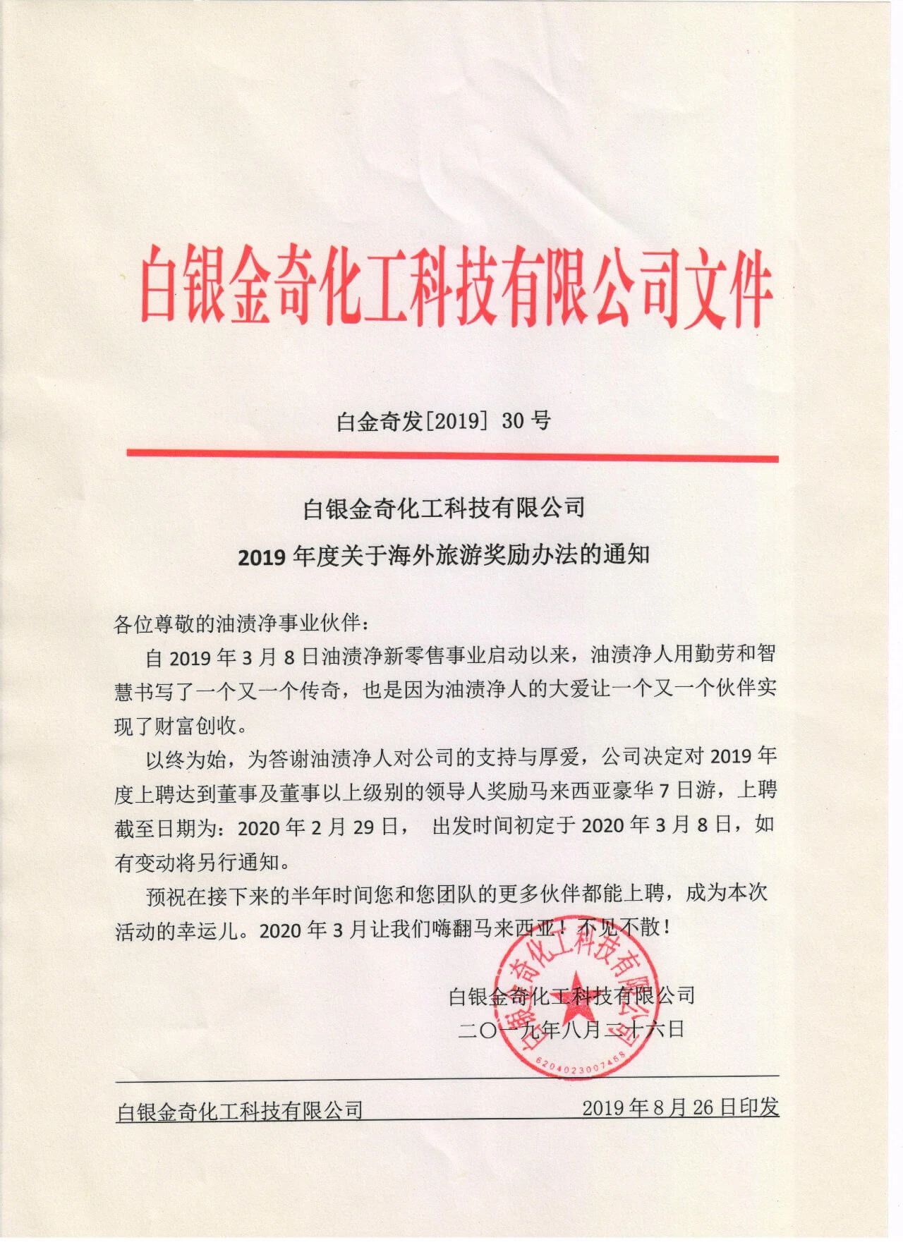 在2019年的8月,金奇化工更是通过海外旅游的方式刺激参与者们发展团队,升级成为董事或董事以上级别,获得参与机会。