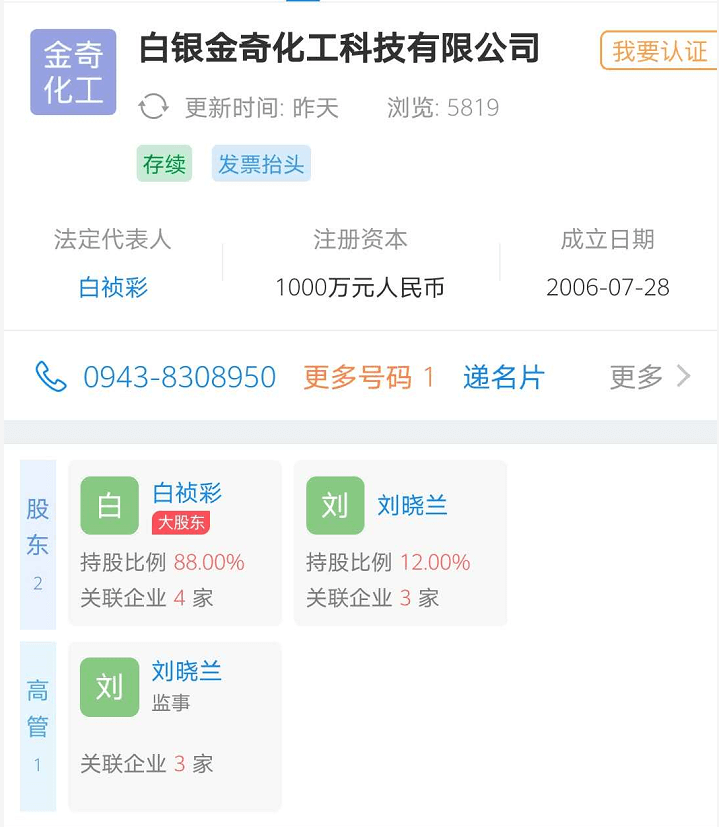 据白银金奇化工科技有限公司(以下简称金奇化工)官方网站(网址:www.byjinqi.com)介绍,公司成立于2006年7月,位于中国科学院白银国家高新技术产业开发区。
