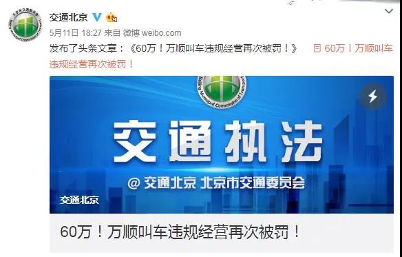 5月11日,北京市交通执法总队根据前期线索摸排和调查取证,发现万顺叫车平台未取得北京市网约车经营许可,违规在京经营网约车业务的违法行为,因此约谈了该企业负责人,责令其立即停止违规经营行为,并依据《北京市查处非法客运若干规定》、《网络预约出租汽车经营服务管理暂行办法》对万顺叫车平台做出予以60万元罚款的行政处罚。