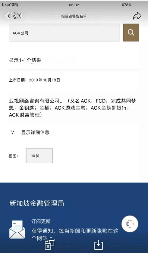 据称,AGK显示已经注销,而且新加坡金融管理局已经把AGK拉入警告黑名单了。而且称以下网站全都在新加坡金融管理局投资者黑名单警告范围内,并不受任何保护。