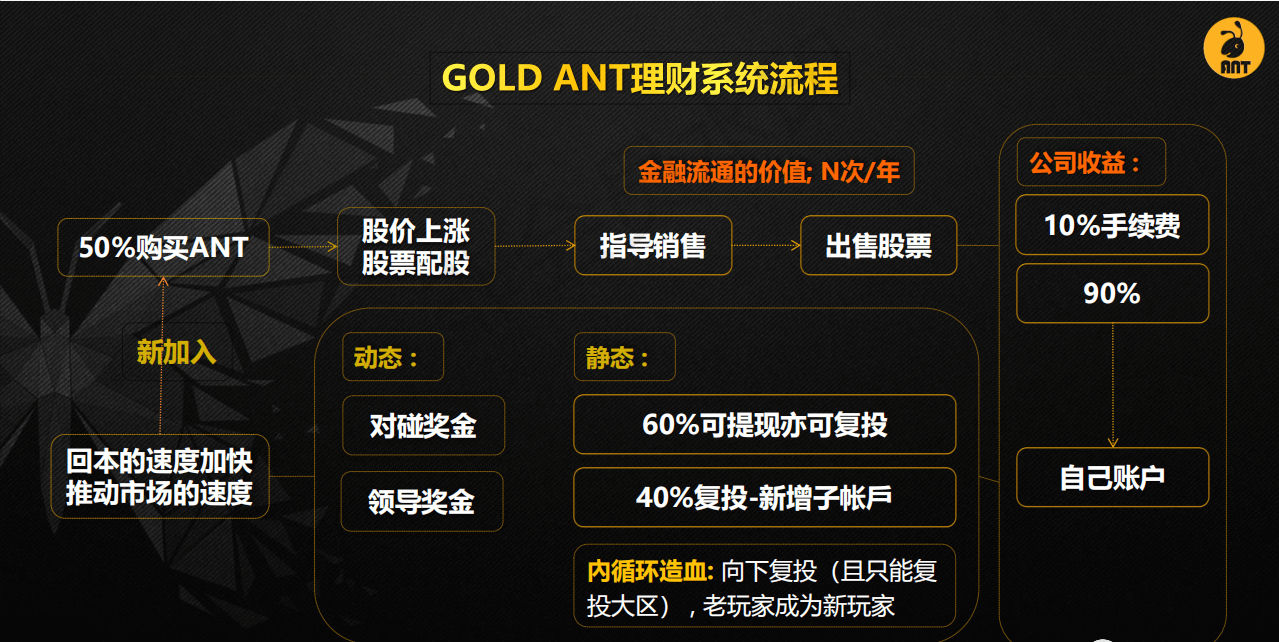 静态奖为,ANT卖出以后,60%自由提现,40%转换为复投积分,重新增加新账户(只能添加到大区)。