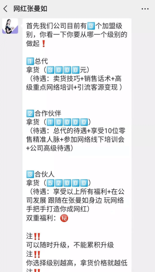 对此,相关业内人士表示:“缴纳更多的费用就虽然会获得更高的利润,高回报意味着高风险,会有更多的产品囤积在高级别代理商手中,而。一旦招募不到代理,或者是产品价值不被认同,甚至是产品质量不够稳定致使用者体验较差,都会导致血本无归。”