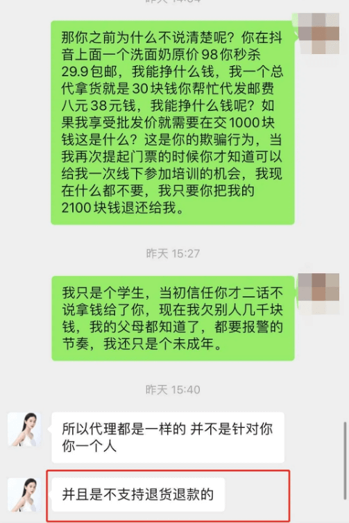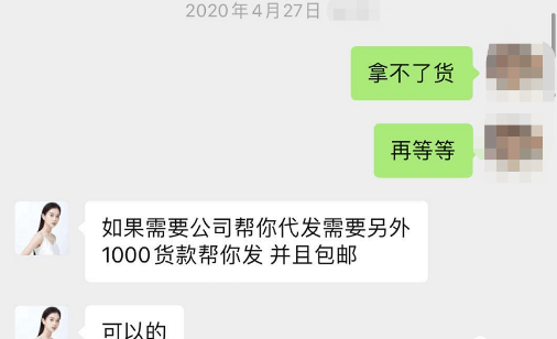 今年2月27日,李萌通过张曼如所提供的支付方式向其支付了3000元的代理费,据李萌表示:“由于还在上学读书,没有固定收入,3000元是通过高息网贷借的。”然而,交了入门费的李萌发现,欧束的张曼如并没有如期兑现其承诺,据李萌反映,由于疫情的原因,4月25日才收到只有900元的货。