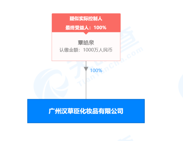 据天眼查显示,广州汉草臣化妆品有限公司成立于2019年10月14日,注册资本1000万人民币,法定代表人是覃皓泉,担任执行董事兼总经理,汉草臣(03-日化用品)已注册。