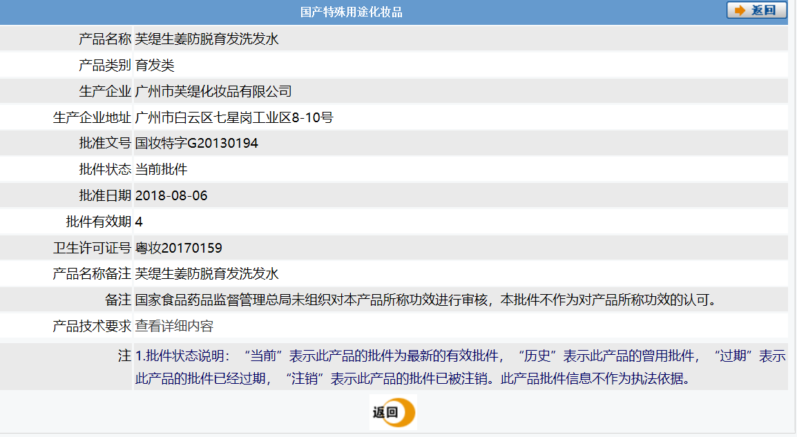 随后,中新融媒在国家药品监督管理局官网查询该产品并非广州汉草臣化妆品有限公司生产,而是由广州市芙缇化妆品有限公司,该洗发水备案名称是“芙缇生姜防脱育发洗发水”,该洗发水在国家药品监督管理局官网备注信息显示,“国家食品药品监督管理总局未组织对本产品所称功效进行审核,本批件不作为对产品所称功效的认可。”