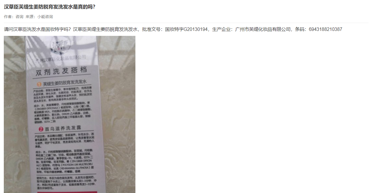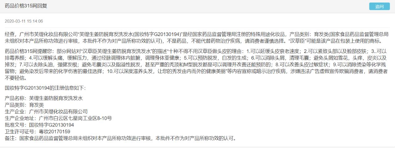 此外,中新融媒在“药品价格315网”发现,今年3月11日就有消费者咨询“汉草臣芙缇生姜防脱育发洗发水”是否真有功效?而药品价格315网回复是,经查,广州市芙缇化妆品有限公司“芙缇生姜防脱育发洗发水(国妆特字G20130194)”是经国家药品监督管理局注册的特殊用途化妆品,产品类别:育发类(国家食品药品监督管理总局未组织对本产品所称功效进行审核,本批件不作为对产品所称功效的认可),不是药品,不能代替药物治疗疾病,请消费者谨慎选择。“汉草臣”可能是该产品在包装上使用的商标。
