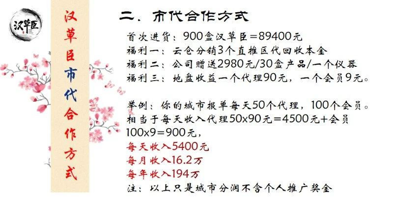 据相关代理商表示:“省代一套产品的分润是2块,市代是3块,区代是6块,以黑龙江省代为例,销售1000盒洗发水赚2000元,销售一万盒洗发水赚两万元,一个省的代理商都做起来,一天销售一万盒问题不大。”