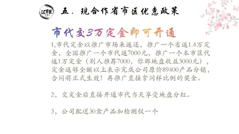 “汉草臣”洗发水分为区代、市代、省代。其中,市代的保证金是3万,省代的保证金是6万,同时给30套产品再赠送一台头皮检测仪。