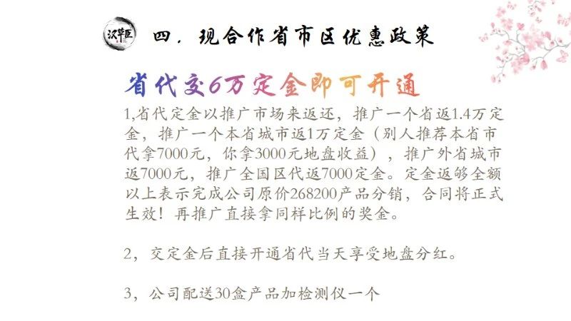 “升级包不是长期有,只是短期给至尊VIP的一些福利,同时为了做大市场,抓紧时间去推荐至尊VIP,然后给至尊VIP升级,福利时间有限,随时会喊停。”以上市场负责人说道:“当团队人数达到100人的,会自动升级为市场经理,市场经理可以拿全国销量的分红。”