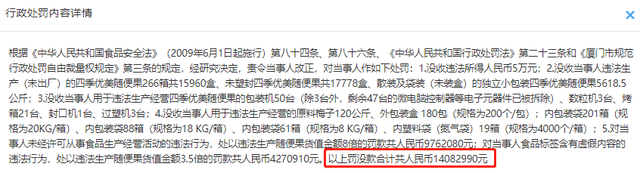 企查查数据显示:厦门优美四季生物科技有限公司因2015年6月29日至2015年7月13日,未取得食品生产许可在集安路768号厂房3楼生产四季优美随便果,随便果上标注“产地:台湾”、“生产日期:2015年06月16日”与实际产地和生产日期不符。2016年7月26日,厦门市市场监督管理局对其处罚没款合计人民币14082990元。
