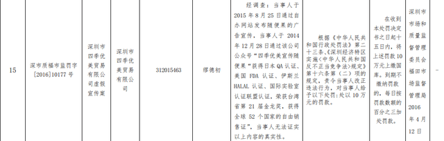 根据深圳市市场监督局福田局《深市质福市监罚字 [2016]10177号行政处罚书》显示:四季优美因通过在该公司公众号宣传“四季优美宣传随便果”获得日本 QA 认证、美国 FDA 认证、伊斯兰HALAL 认证、国际实验室认证联盟认证,荣获台湾省第 21 届金龙奖,获得全球 52 个国家的自由销售证”等内容,被认定为虚假宣传,处罚款10万元。
