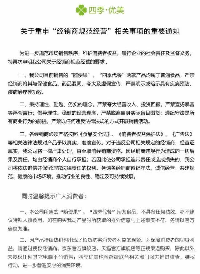 概括来说,《通知》说明了几件事:第一,四季优美的两款产品均为普通食品,无任何功效,严禁经销商虚假夸大;第二,要求经销商合法经营,不得夸大收入和投资回报,不得宣扬暴富;第三,严禁经销商以违法的方式进行经营。