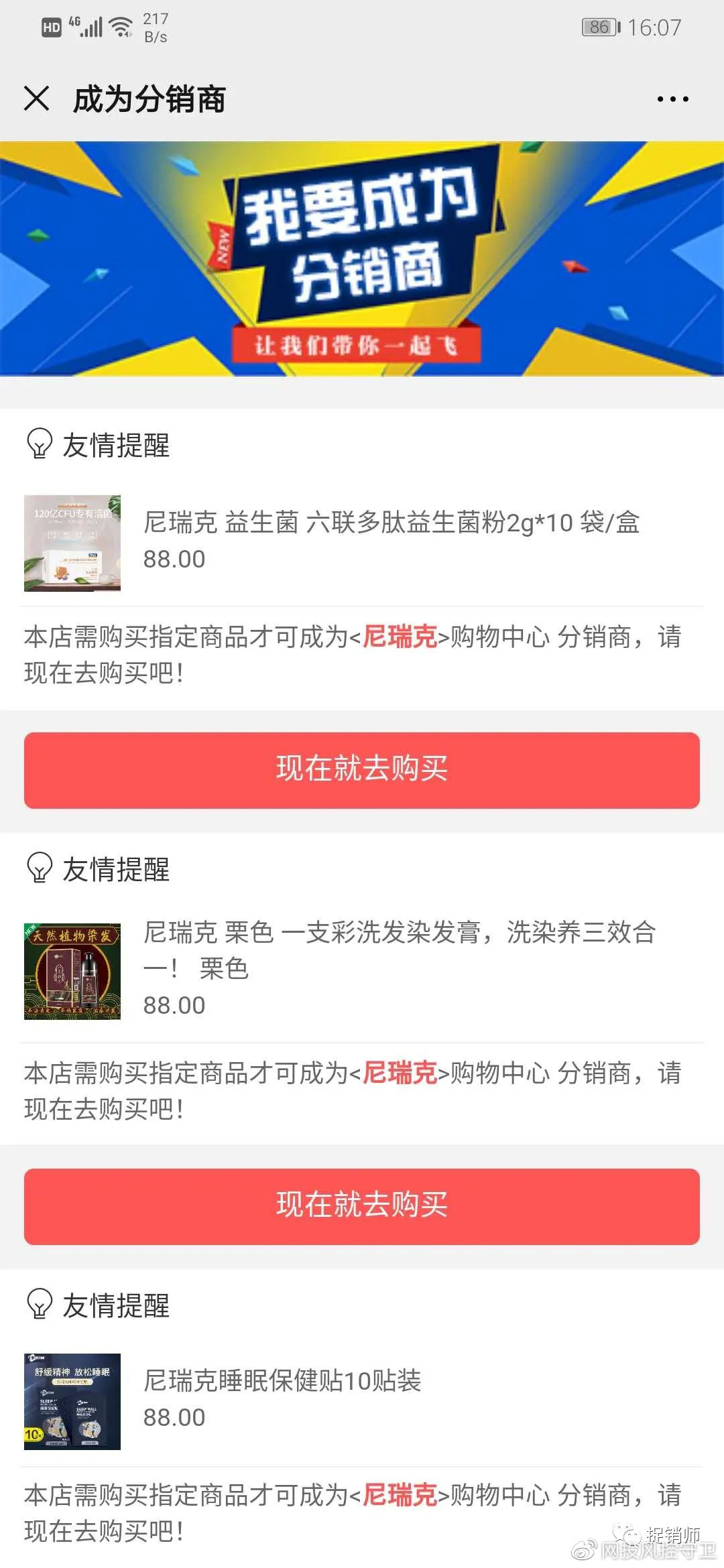 首先需要在尼瑞克商城内购买指定商品才能成为购物中心分销商,购买价值88元的睡眠贴、染发膏、益生菌等。付款购买成功后即可获得推广码,随即层层裂变、返利。