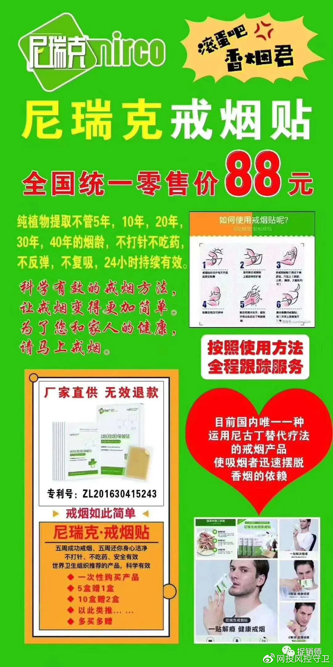 据称,尼瑞克戒烟贴是厂家直接全面开展全国市场的工作,包括生产、销售、发货、售后一条龙服务,88元拿一盒就成为普通代理。