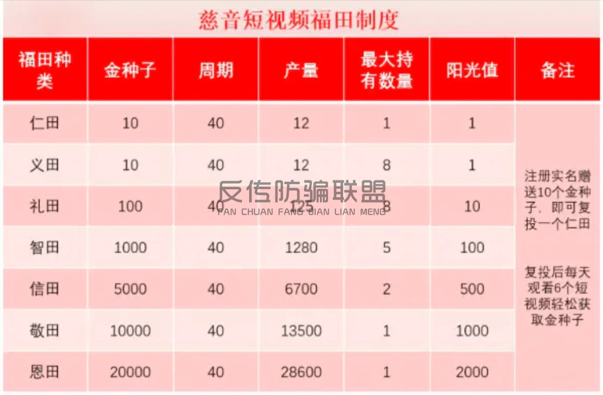 据反传防骗联盟了解,参与者注册成为“慈音短视频”会员并实名认证后,就可以获得一个任务包,会员每天观看10分钟视频和点10个赞,连续40天就能产出12个“金种子”,产出的个“金种子”可以购买“福田”继续产出“金种子”。