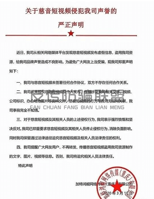 该声明中提到,加特鸿鲲公司与“慈音短视频”未签署任何合作协议,从未授权“慈音短视频”及个人发布、传播涉及我司相关文字、视频、公司标识、办公场地图片等资料文件。
