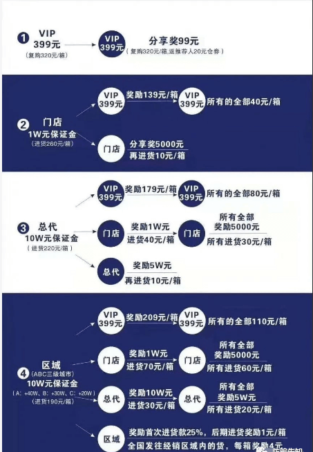 娃哈哈妙眠的代理入门资格为保证金模式,即缴纳一万到五十万不等的保证金,就可以获得发展下线的资格,同时也获得代理销售的资格,奖金制度我们下面再说。这个保证金如果不完成销售任务是不退的,门店经销商的年销量为500箱,总代经销商的年销量为5000箱,区域经销商的年销量为50000箱。每箱的零售价为599元,
