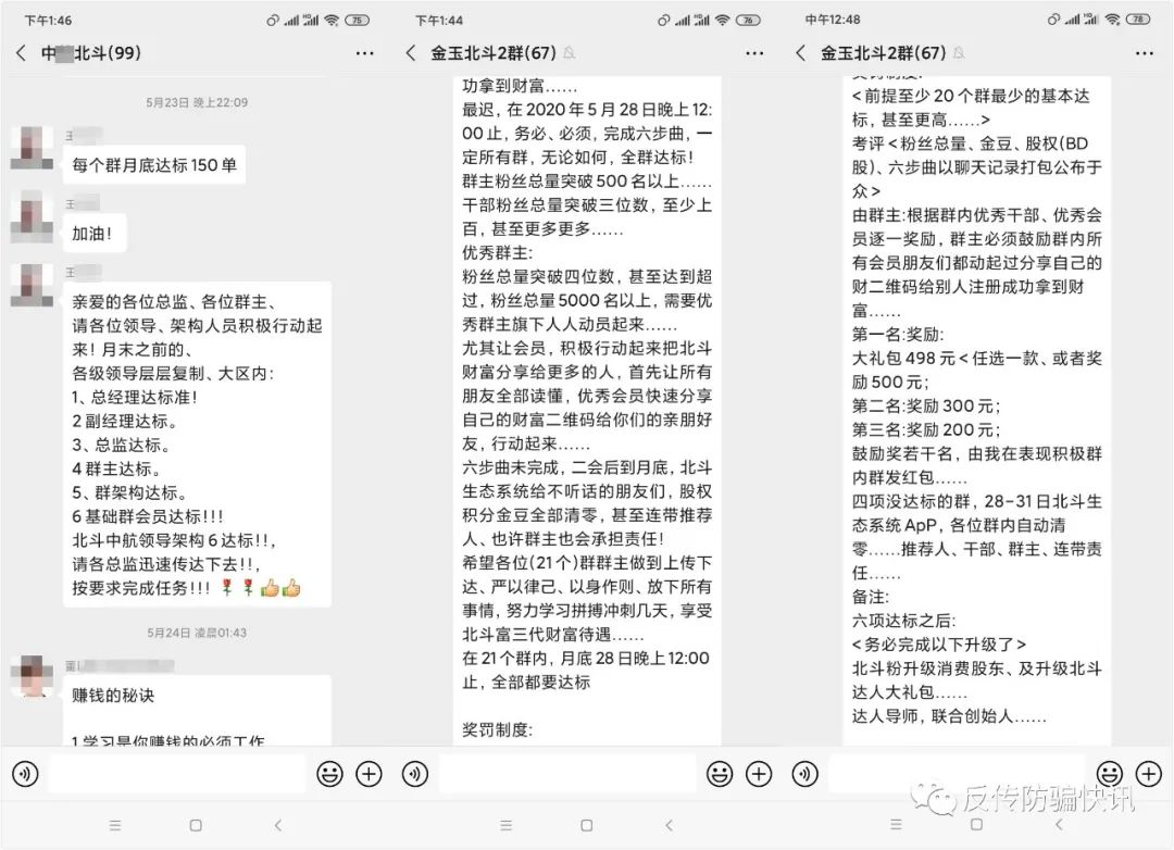 反传防骗快讯在该群中看到,完成“6达标” 的相关人员,由群主根据群内优秀干部、优秀会员逐一奖励。其中第一名奖励498元大礼包或现金500元,第二名奖励300元,第三名奖励200元。如有四项没达标的,其股权、积分、金豆全部清零,甚至连推荐人、群主也会承担责任。例如,群主必须发展500人以上,优秀群必须发展四位数以上。