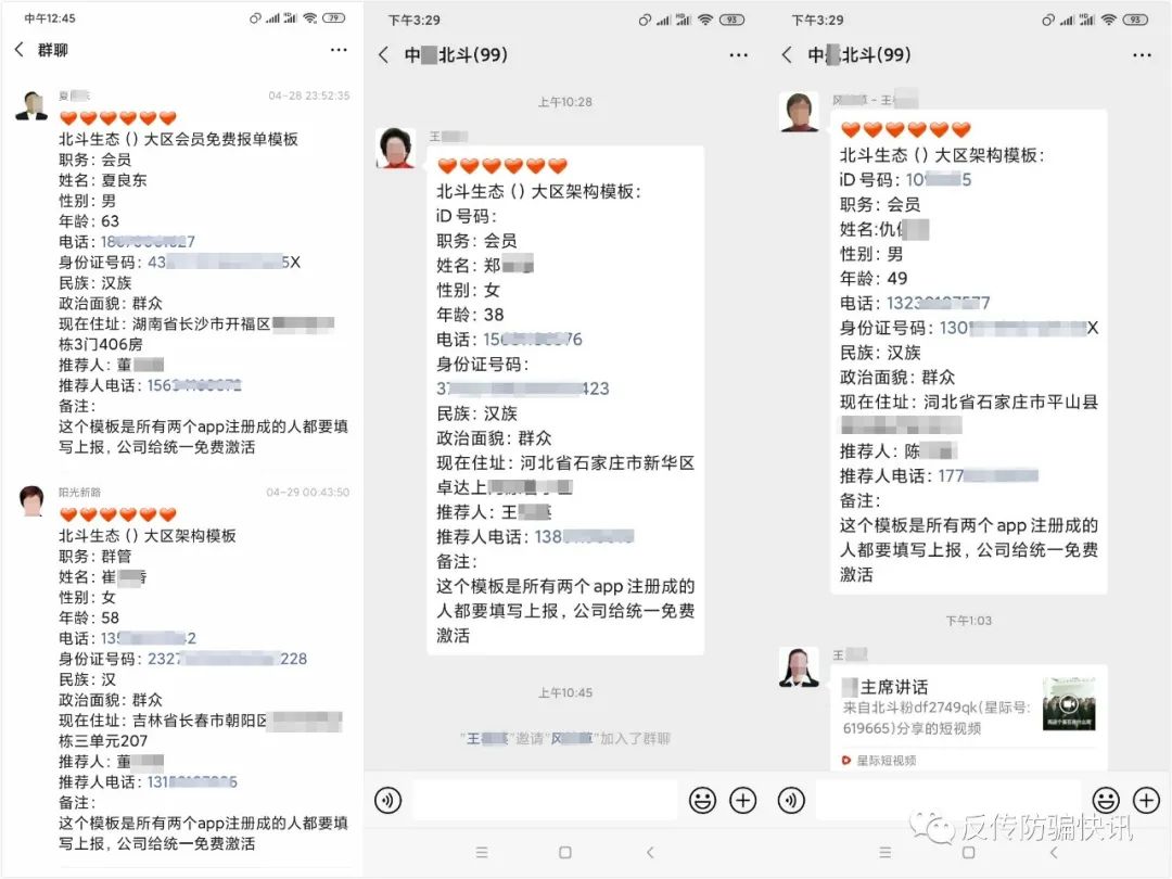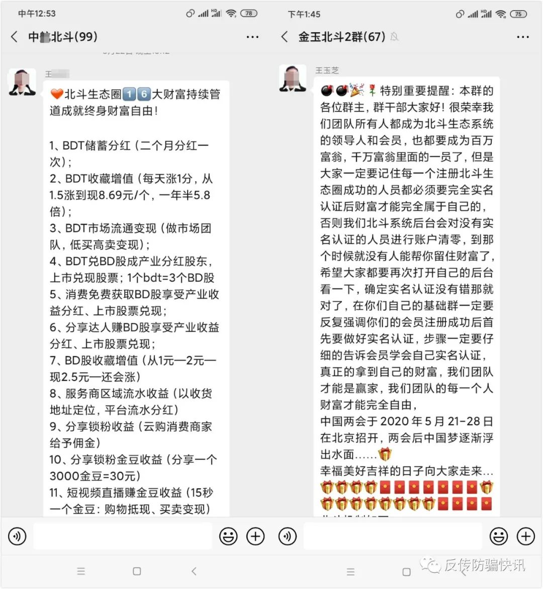 近日,反传防骗快讯注意到多个微信群在推广一个叫做“北斗生态圈️️”的平台,打着中国梦的旗号,以送BD股权、获得高额回报等名义,大肆“拉人头”投资,并收集公民个人信息,上述行为存在非法集资、传销等风险。