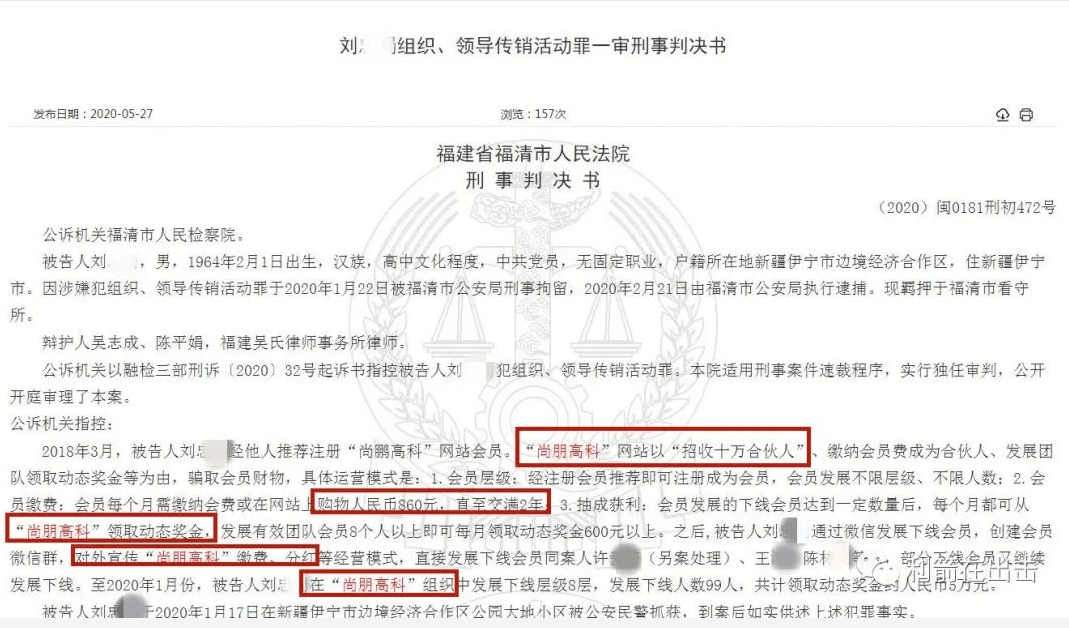 “尚朋高科”是传销,一骨干被判刑1年2个月,并处罚金人民币2万元!