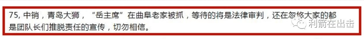2019年9月10日最早报道了“中销联合”“青岛大狮”岳某华被抓的消息,这个消息在今年5月份官方媒体才报道出来。在下面这篇文章第75个中,利箭有最早报道。