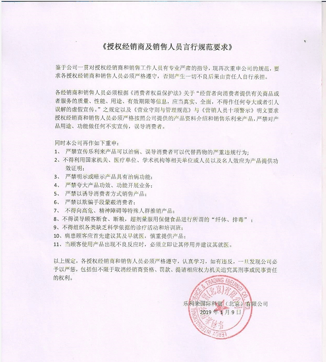 夸大宣传行为甚至在乐利来国际早有前科,下级的经销商或者销售团队会“复制”也属于正常行为。从前文中《授权经销商及销售人员言行规范要求》我们可以看出乐利来国际对经销商的种种行为是知情 的。