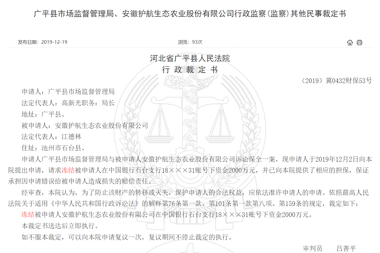 2019年12月2日,河北省邯郸市广平县市场监督管理局通过法院冻结了安徽护航生态农业股份有限公司位于中国银行石台支行的共计2000万元资金。业内人士猜测,市场监管部门冻结资金一般是对被冻结方进行涉案调查,且大概率是基于涉嫌传销案件调查冻结资金。